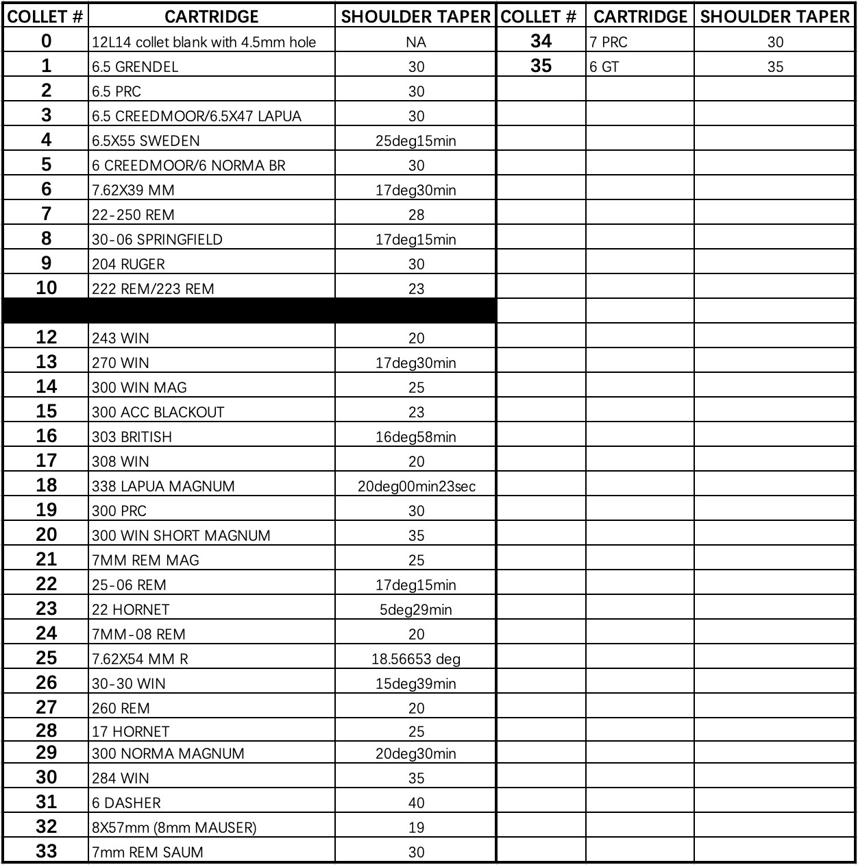 #0 – Blank, #1 – 6.5 Grendel, #2 – 6.5 PRC, #3 – 6.5 Creedmoor/6.5 x 47 Lapua, #4 – 6.5 x 55 Sweden, #5 – 6 Creedmoor/6 Norma BR, #6 – 7.62 x 39mm, #7 – 22-250 Rem, #8 – 30-06 Springfield, #9 – 204 Ruger, #10 – 222 Rem/223 rem, #12 – 243 Win, #13 – 270 Win, #14 – 300 WIN MAG, #15 – 300 ACC BLACKOUT, #16 – 303 British, #17 – 308 Win, #18 – 338 Lapua Magnum, #19 – 300 PRC, #20 – 300 Win Short Magnum, #21 – 7mm Rem Mag, #22 – 25-06 Rem, #23 – 22 Hornet, #24 – 7mm-08 Rem, #25 – 7.62 x54mm R, #26 – 30-30 Win, #27 – 260 Rem, #28 – 17 Hornet, #29 – 300 Norma Magnum, #30 – 284 Win, #31 – 6 Dasher, #32 – 8 x 57mm (8mm Mauser), #33 – 7mm Rem SAUM, #34 – 7 PRC, #35 – 6 GT
